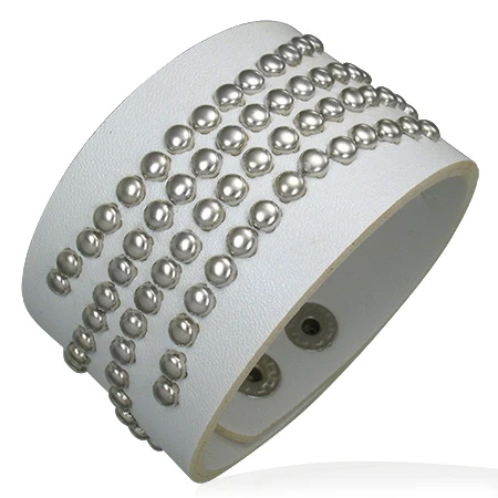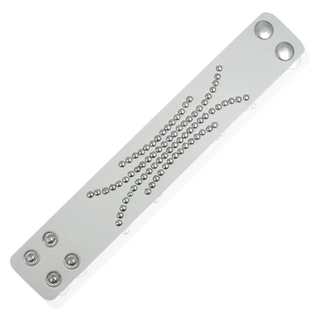 Náramek vyrobený z pravé kůže. Kožený náramek zdobený kovovými cvoky. Náramek je široký 3,6cm. Zapínání náramku je patentní. Náramek lze zapnou na úrovni délek 19cm a 20,5cm.