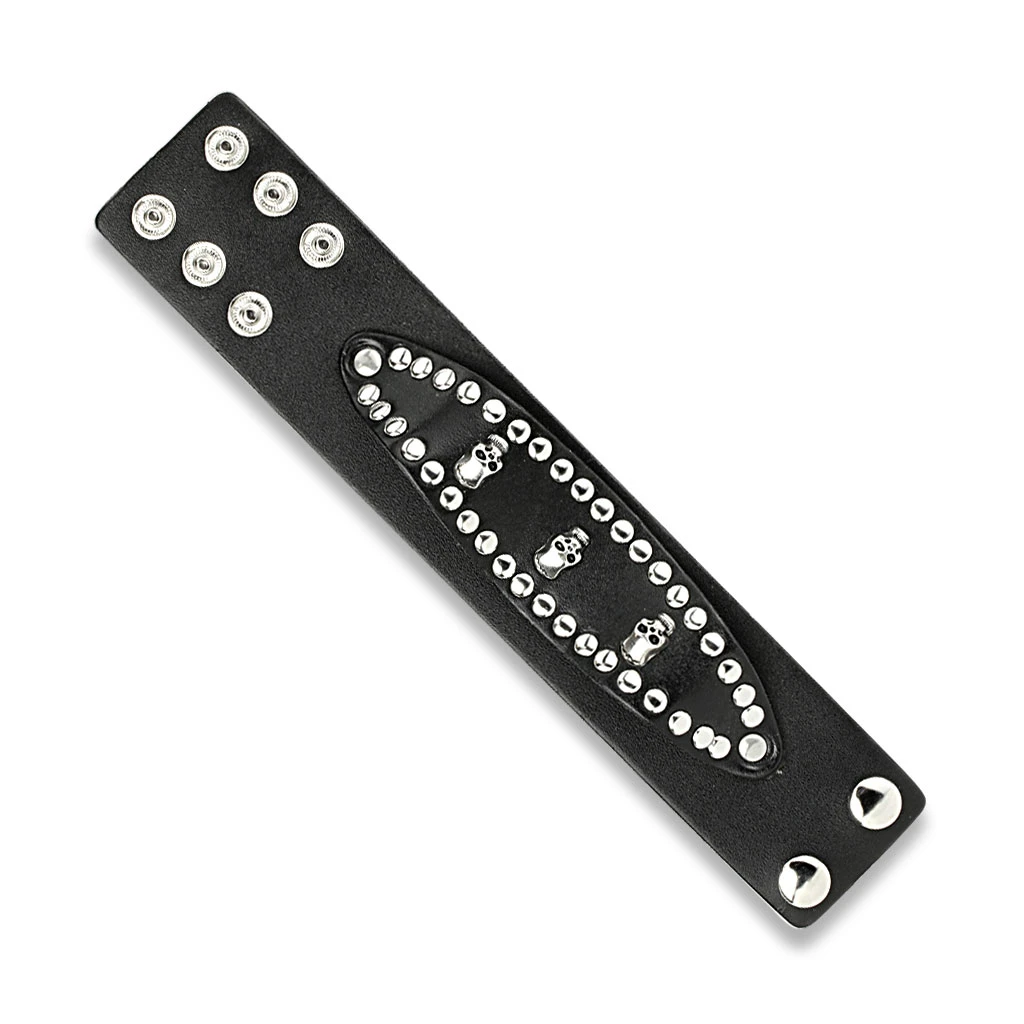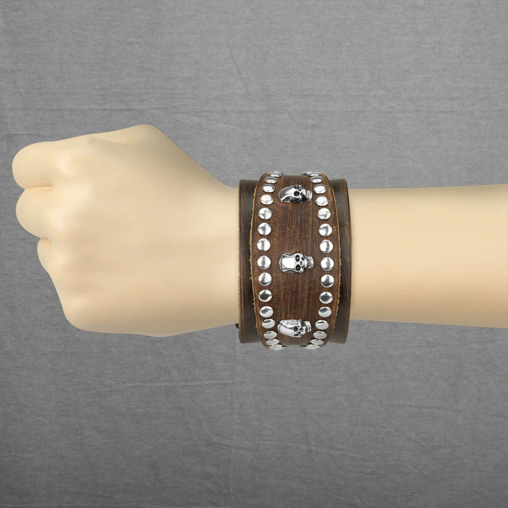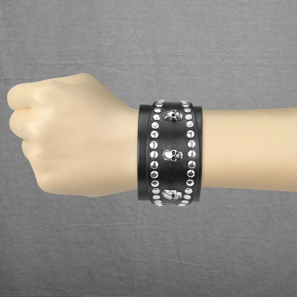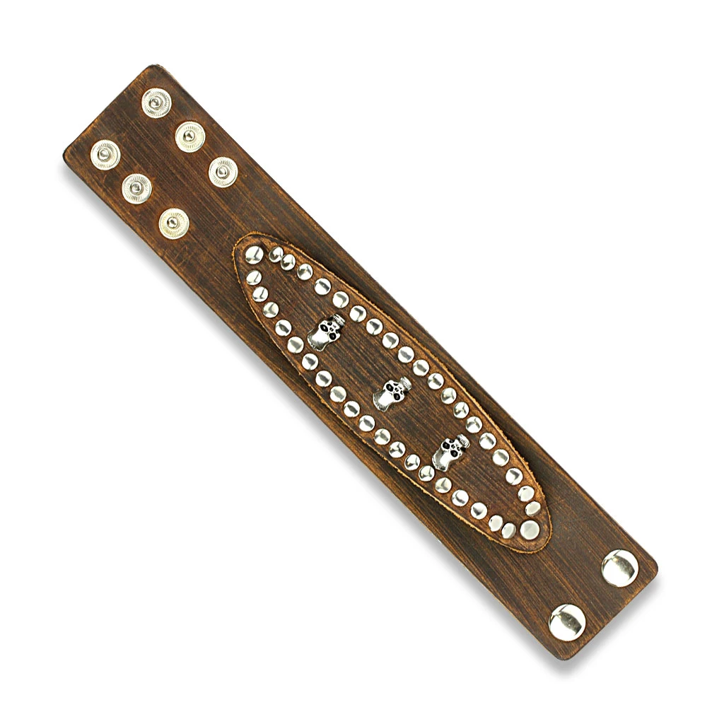 Pánský kožený náramek se zapínáním na patentky. Náramek je široký 45mm. Široký kožený náramek ozdobený kovovými lebkami a cvoky. Dvojité zapínání na patentky lze zapínat na úrovni délek 19,21,22cm.