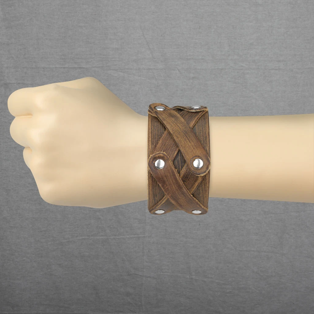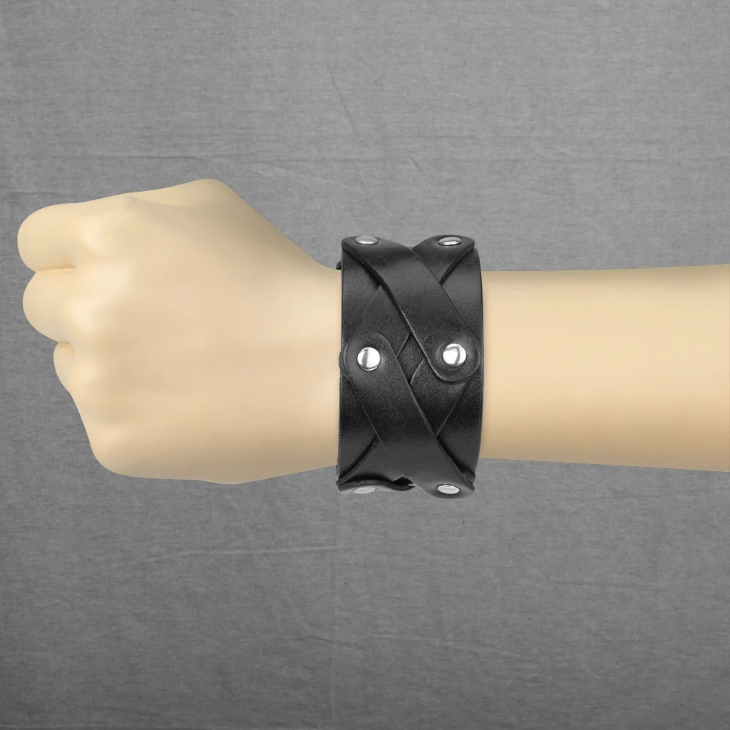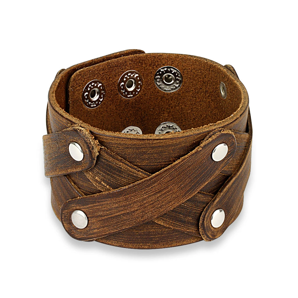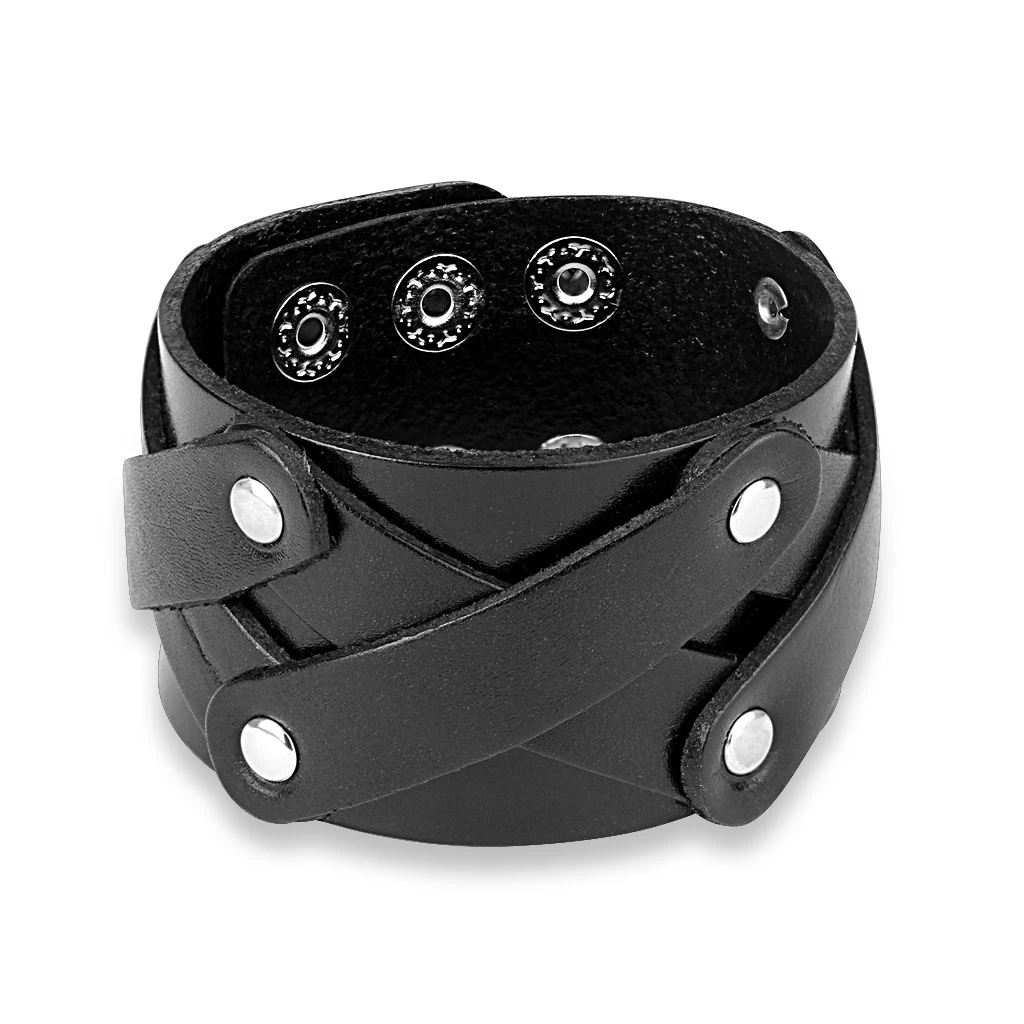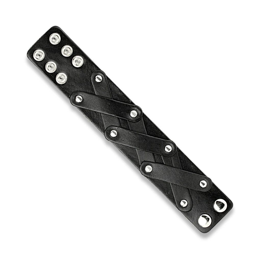 Pánský kožený náramek se zapínáním na patentky. Náramek je široký 40mm. Široký kožený náramek ozdobený kovovými cvočky. Dvojité zapínání na patentky lze zapínat na úrovni délek 19,21,22cm.