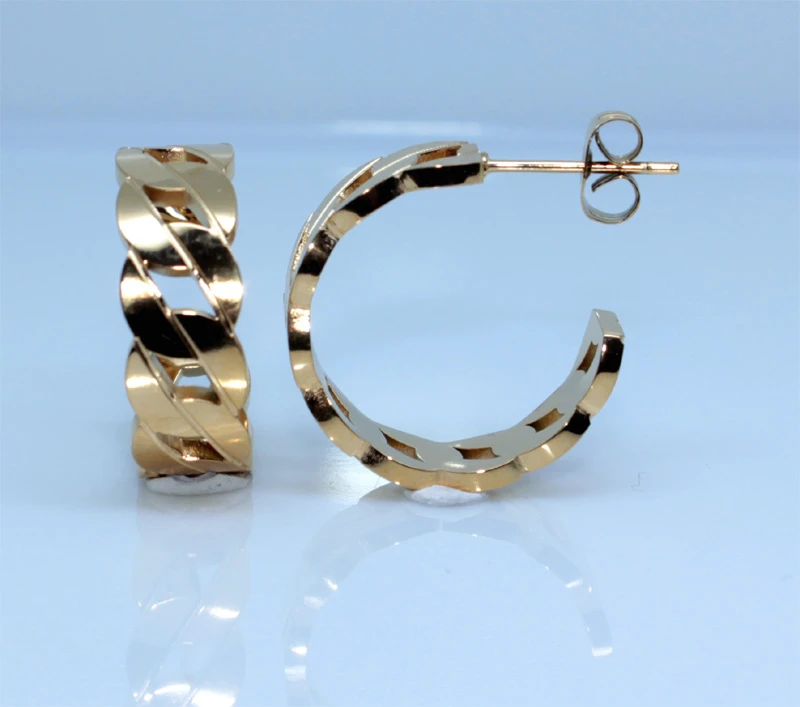 Dámské ocelové náušnice kruhového tvaru. Povrch náušnic je pozlacený technologií PVD, průměr náušnic 20mm, šířka 7mm. Náušnicové zapínání je na puzetky.