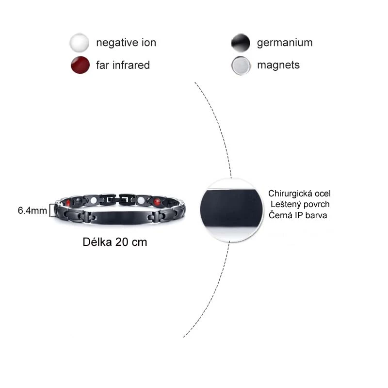 Dámský ocelový náramek s magnety. Povrch náramku je černý, upravený technologií IP. Náramek je dlouhý 20cm s možností zkrácení. Šíře náramku 6,4mm.