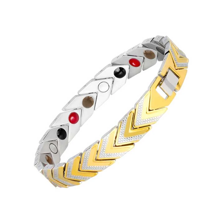 Magnetický náramek na paži z chirurgické oceli. Jako všechny šperky zhotovené z materiálu chirurgická ocel, je také tento náramek odolný proti poškození, nevyvolává magnetické reakce, neoxiduje, chirurgická ocel nemění barvu. Díky těmto vlastnostem a přijatelné ceně se ocelové šperky těší stále značně vysoké popularitě ve stále se rozšiřujících řadách spokojených uživatelů.