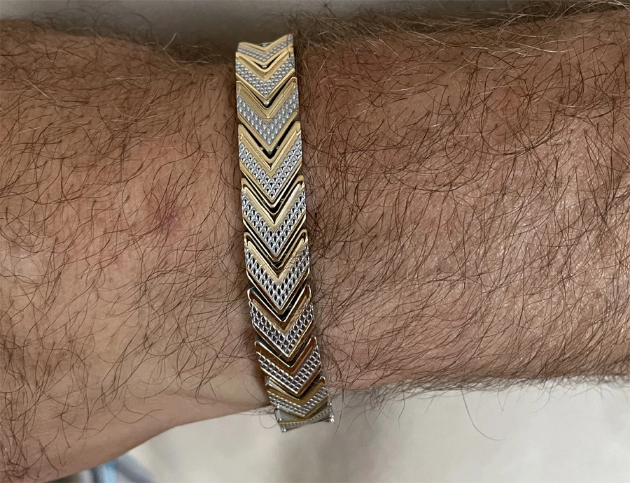 Náramek z chirurgické oceli s magnety. Povrch náramku je částečně pokrytý vzorem a částečně pozlacený technologií PVD. Náramek je široký 11 mm, délka náramku 20,5 cm. Délku náramku je možné na přání zdarma zkrátit.