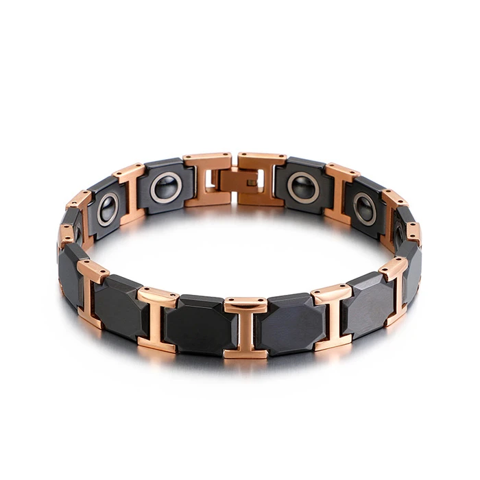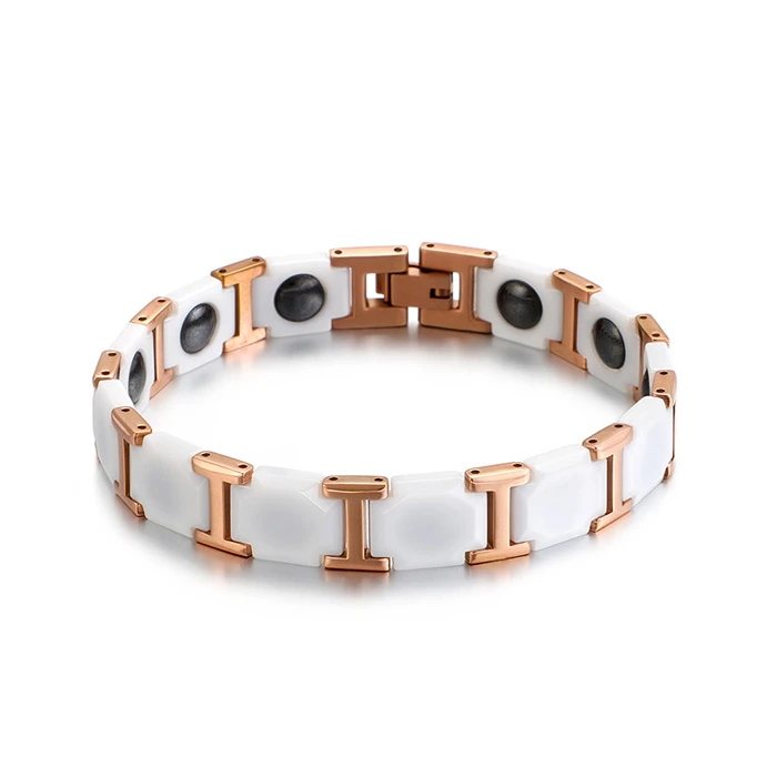 Elegantní magnetický náramek na ruku. Náramek je jedinečná kombinace chirurgické oceli a keramiky. Oba použité materiály jsou odolné proti poškození, nevyvolávají alergické reakce, neoxidují a nemění barvu.