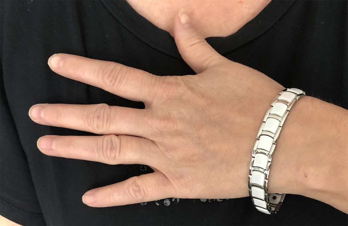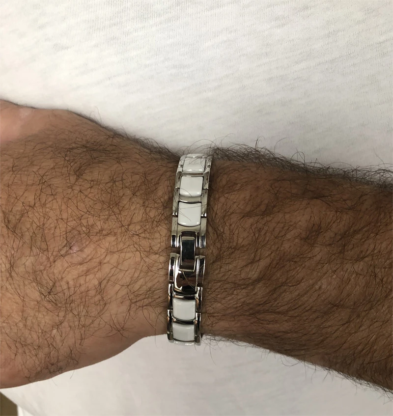 Elegantní magnetický náramek na ruku. Náramek je jedinečná kombinace chirurgické oceli a keramiky. Oba použité materiály jsou odolné proti poškození, nevyvolávají alergické reakce, neoxidují a nemění barvu.