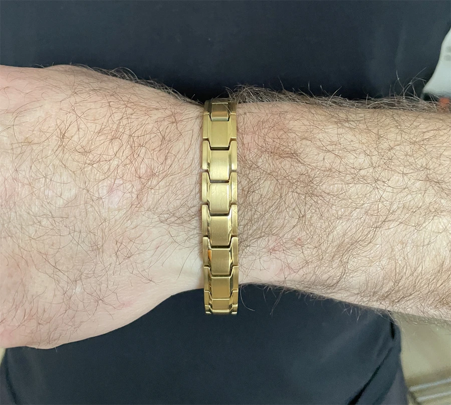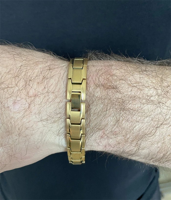 Magnetický náramek na paži z chirurgické oceli. Jako všechny šperky zhotovené z chirurgické oceli nevyvolává alergické reakce, neoxiduje, a je barevně stálý. Díky těmto vlastnostem a přijatelné ceně se ocelové šperky těší stále značně vysoké popularitě ve stále se rozšiřujících řadách spokojených uživatelů.