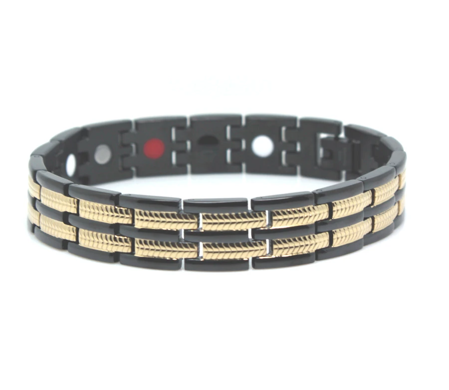 Pánský magnetický náramek na ruku. Povrch náramku je černý se zlatými proužky. Náramek je široký 13mm, délka náramku 21,5cm. Na přání je možné náramek zdarma zkrátit.