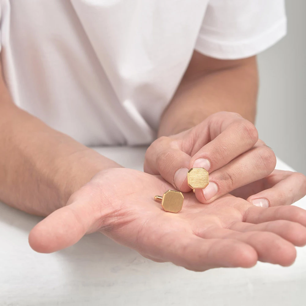 Knoflíčky do manžet z chirurgické oceli 316l. Povrch knoflíčků je pískovaný s leštěnými kraji. Knoflíčky jsou pozlacené technologií PVD. Rozměr knoflíčku 15x15mm.