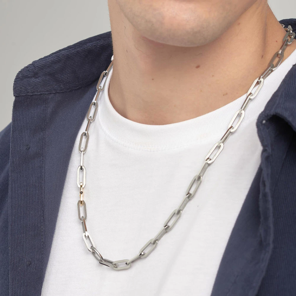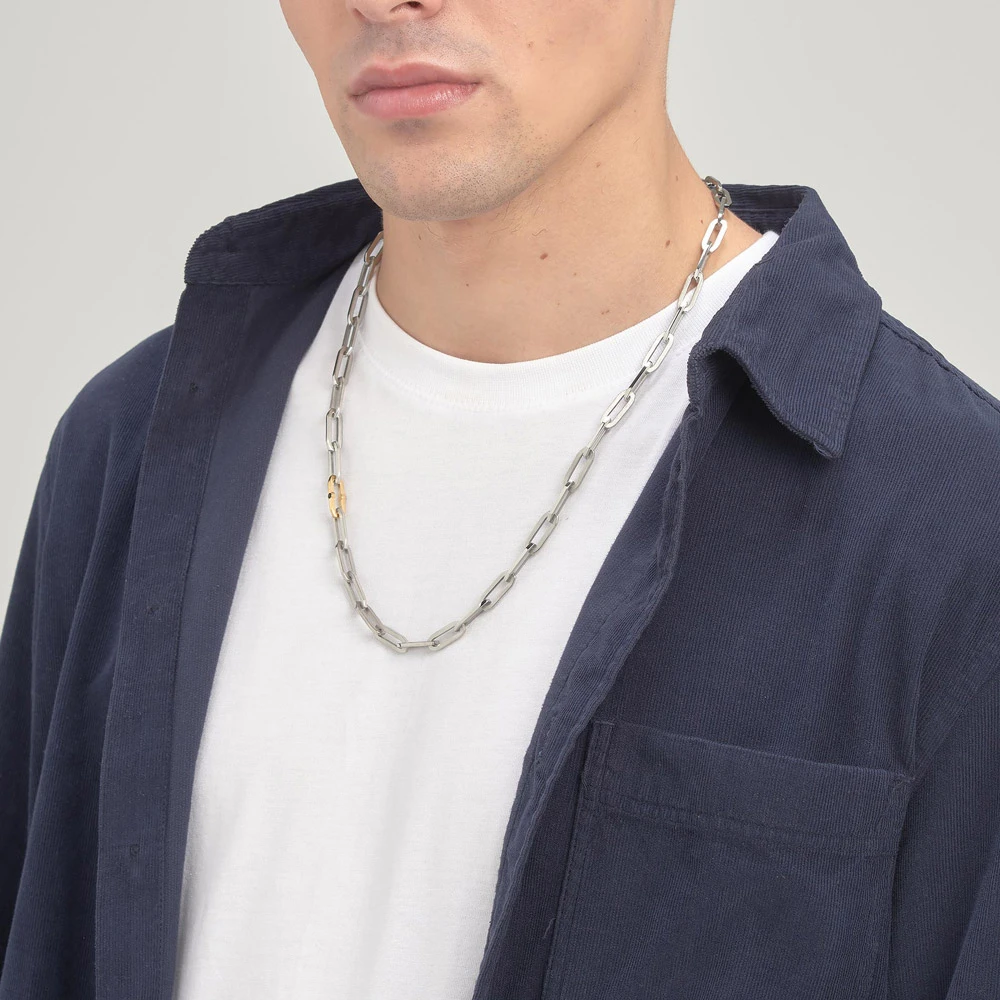 Pánský ocelový náhrdelník z kolekce Caliburn. Náhrdelník je ozdobený pozlaceným článkem technologií PVD a černými krystaly. Délka náhrdelníku 65cm.
