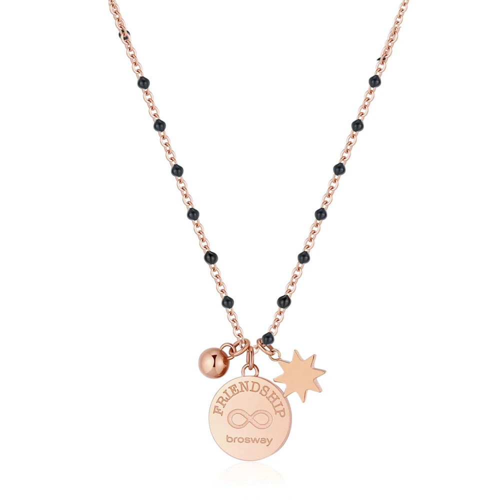 Dámský náhrdelník z chirurgické oceli 316L z kolekce Chakra. Náhrdelník je doplněný přívěškem a ozdobený kamínky z černého smaltu. Povrch náhrdelníku je růžový, upravený technologií PVD. Délka náhrdelníku 44 cm.
