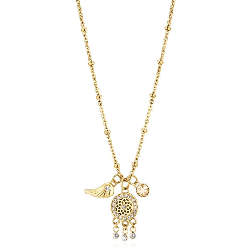 Dámský náhrdelník z chirurgické oceli 316L z kolekce Chakra. Náhrdelník má svoji nositelku ochránit před nepřízní osudu a nevraživostí druhých lidí. Povrch náhrdelníku je pozlacený technologií PVD. Náhrdelník je zdobený bílými krystaly. Délka náhrdelníku 44cm.