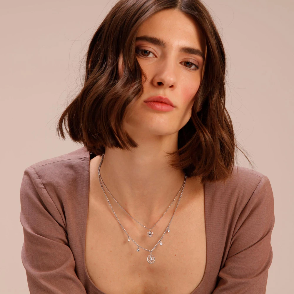 Dámský náhrdelník z chirurgické oceli 316L z kolekce Chakra. Povrch náhrdelníku je leštěný. Náhrdelník je dvouřadový zdobený bílými krystaly a přívěšky. Délka náhrdelníku 49 cm.