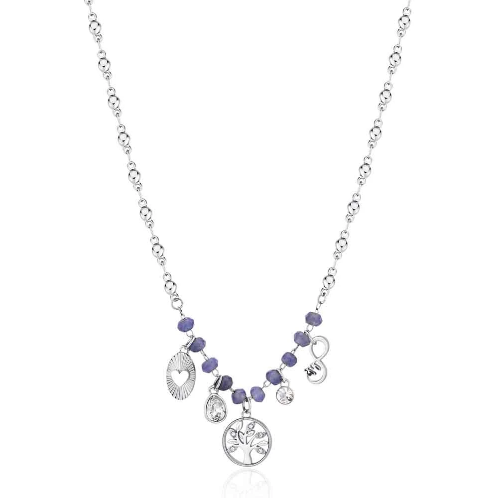 Dámský náhrdelník z kolekce Chakra vyrobený z chirurgické oceli 316L. Povrch náhrdelníku je leštěný. Náhrdelník je ozdobený fialovými minerálními korálky z chalcedonu. Strom života je osazený zářivými krystaly. Délka náhrdelníku 48cm.