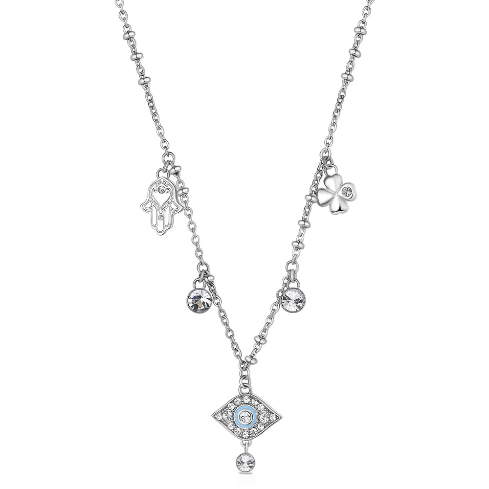 Dámský náhrdelník z chirurgické oceli 316L z kolekce Chakra. Náhrdelník má svoji nositelku ochránit před nepřízní osudu a nevraživostí druhých lidí. Povrch náhrdelníku je leštěný. Náhrdelník je zdobený bílými krystaly a modrým smaltováním. Délka náhrdelníku 47cm.