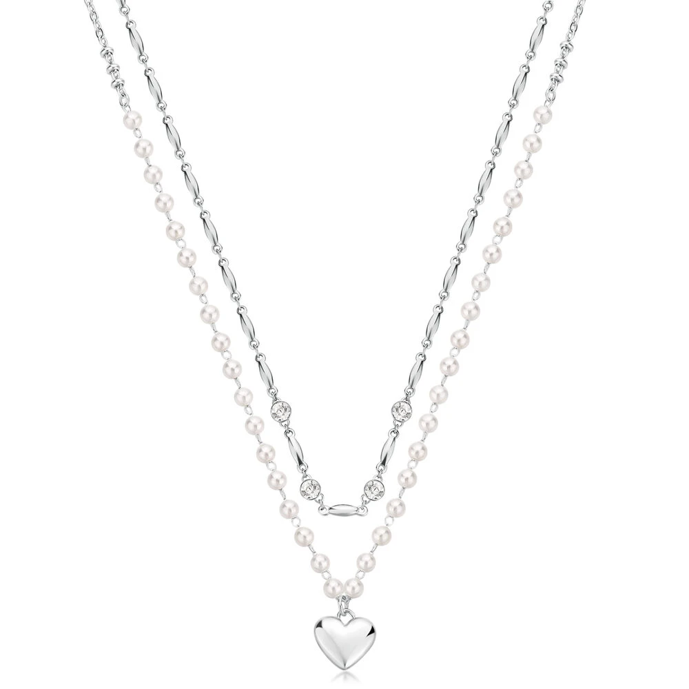 Dvojitý náhrdelník z chirurgické oceli s perličkami, krystaly a srdíčkem. Elegantní náhrdelník dlouhý 46 cm.
