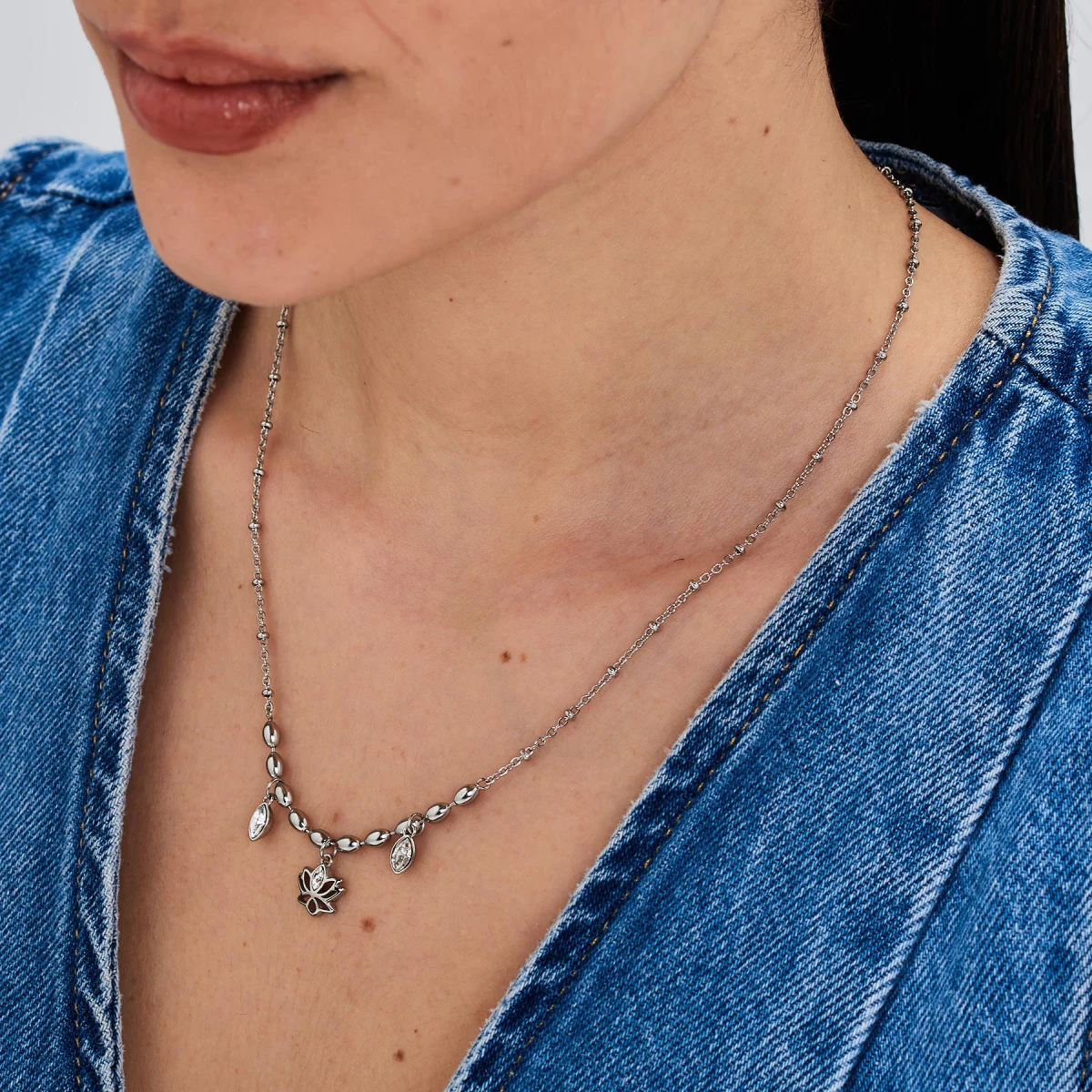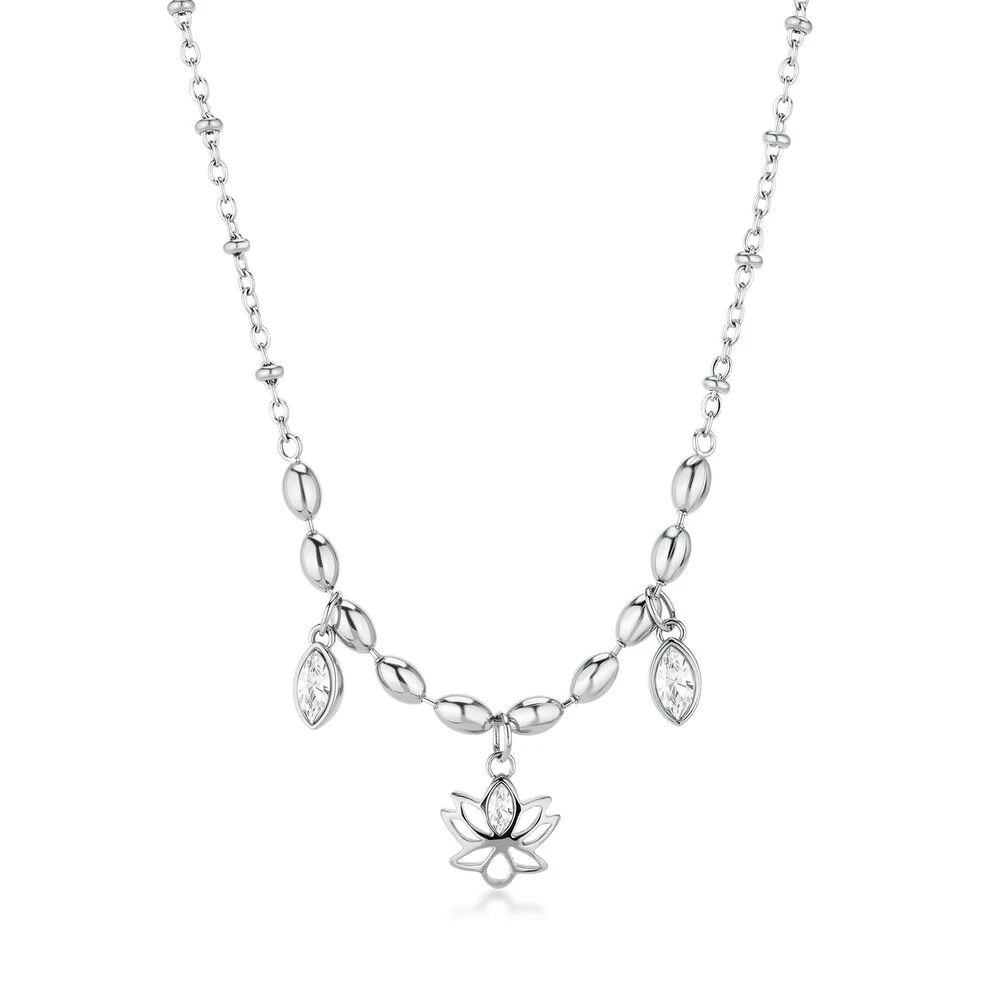Dámský náhrdelník z chirurgické oceli z kolekce Chakra. Náhrdelník má svoji nositelku ochránit před nepřízní osudu a nevraživostí druhých lidí. Povrch náhrdelníku je leštěný. Náhrdelník je zdobený bílými krystaly. Délka náhrdelníku 48cm.