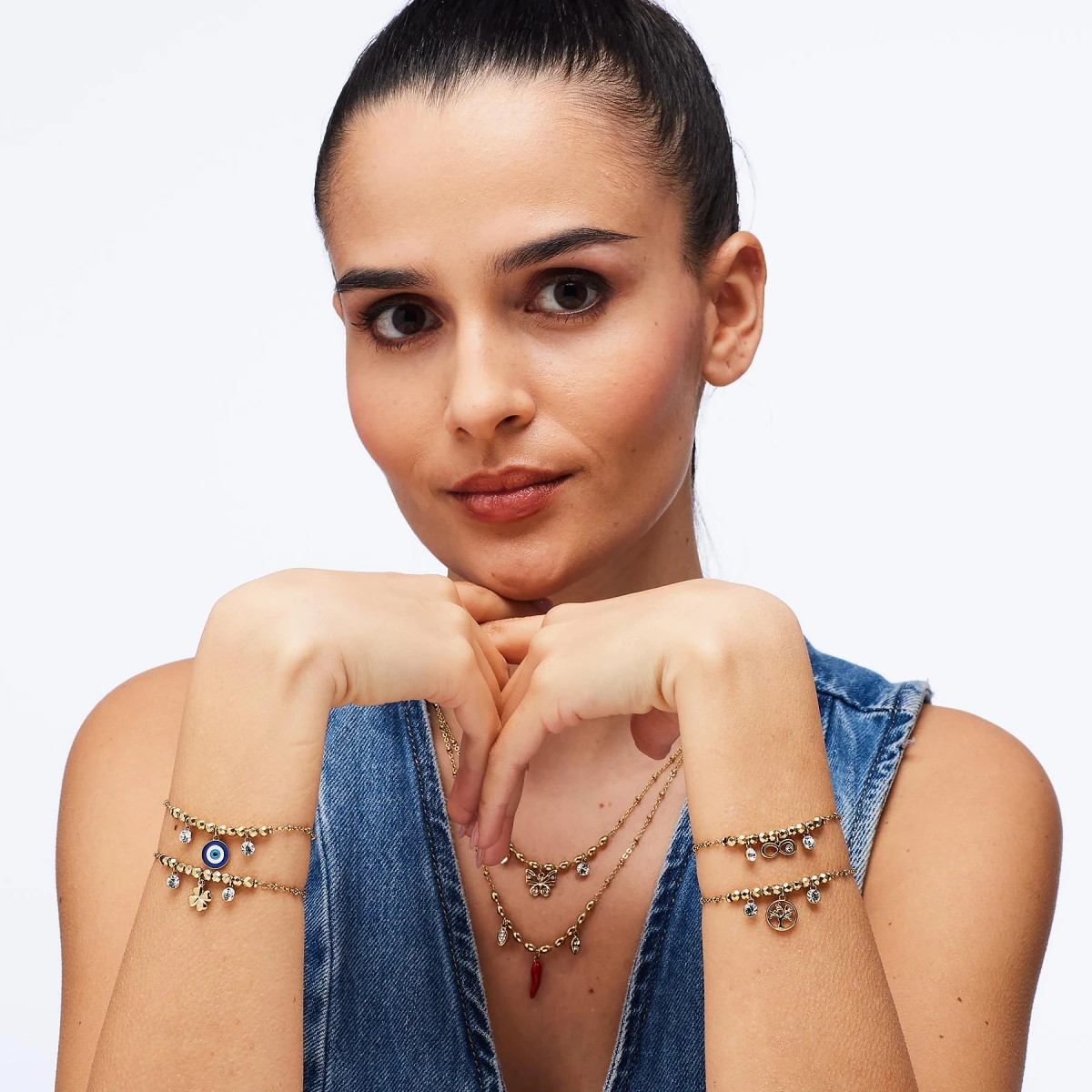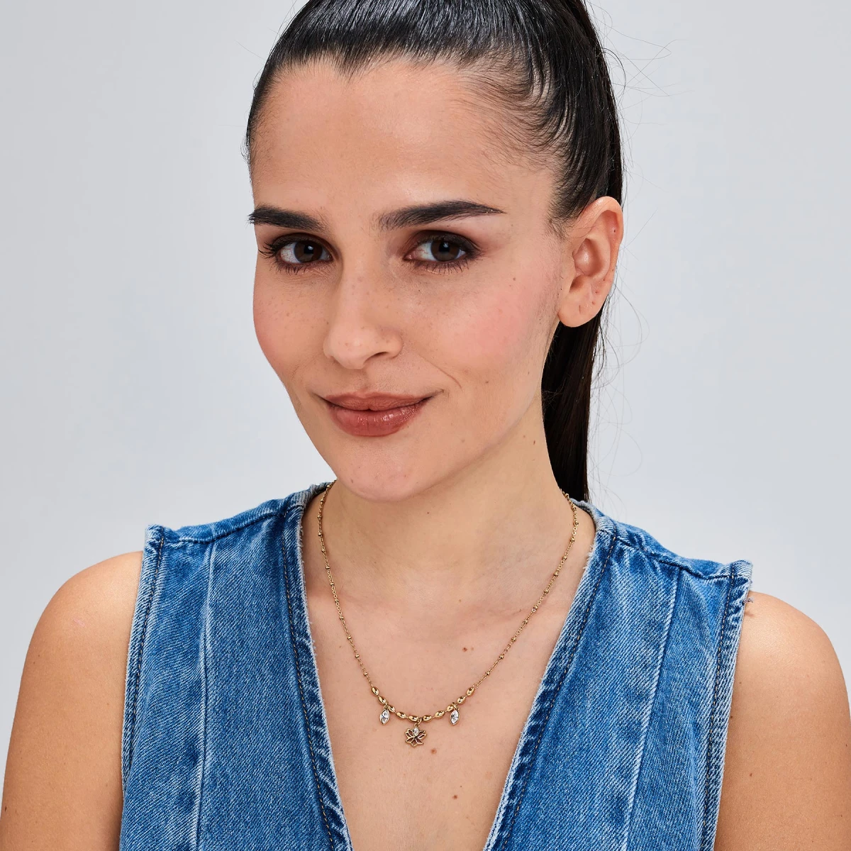 Dámský náhrdelník z chirurgické oceli z kolekce Chakra. Náhrdelník má svoji nositelku ochránit před nepřízní osudu a nevraživostí druhých lidí. Povrch náhrdelníku je pozlacený technologií PVD. Náhrdelník je zdobený bílými krystaly. Délka náhrdelníku 48cm.