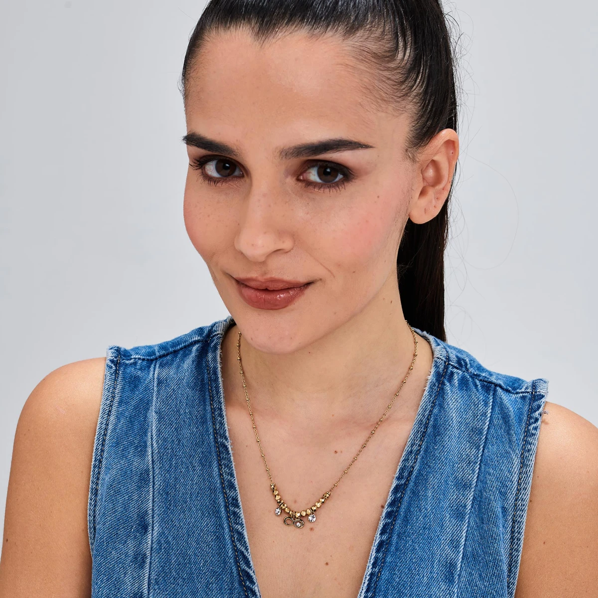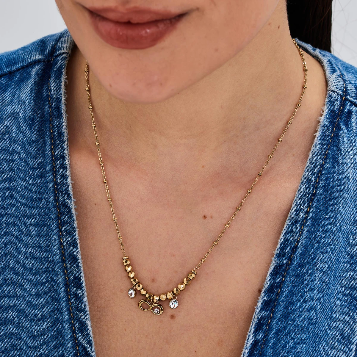 Dámský náhrdelník z chirurgické oceli z kolekce Chakra se symbolem nekonečna. Náhrdelník má svoji nositelku ochránit před nepřízní osudu a nevraživostí druhých lidí. Povrch náhrdelníku je pozlacený technologií PVD. Náhrdelník je zdobený bílými krystaly. Délka náhrdelníku 48cm.