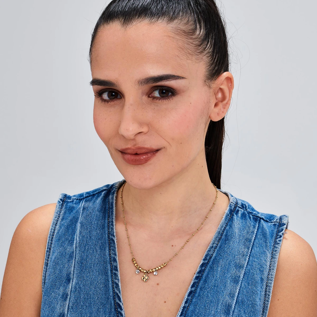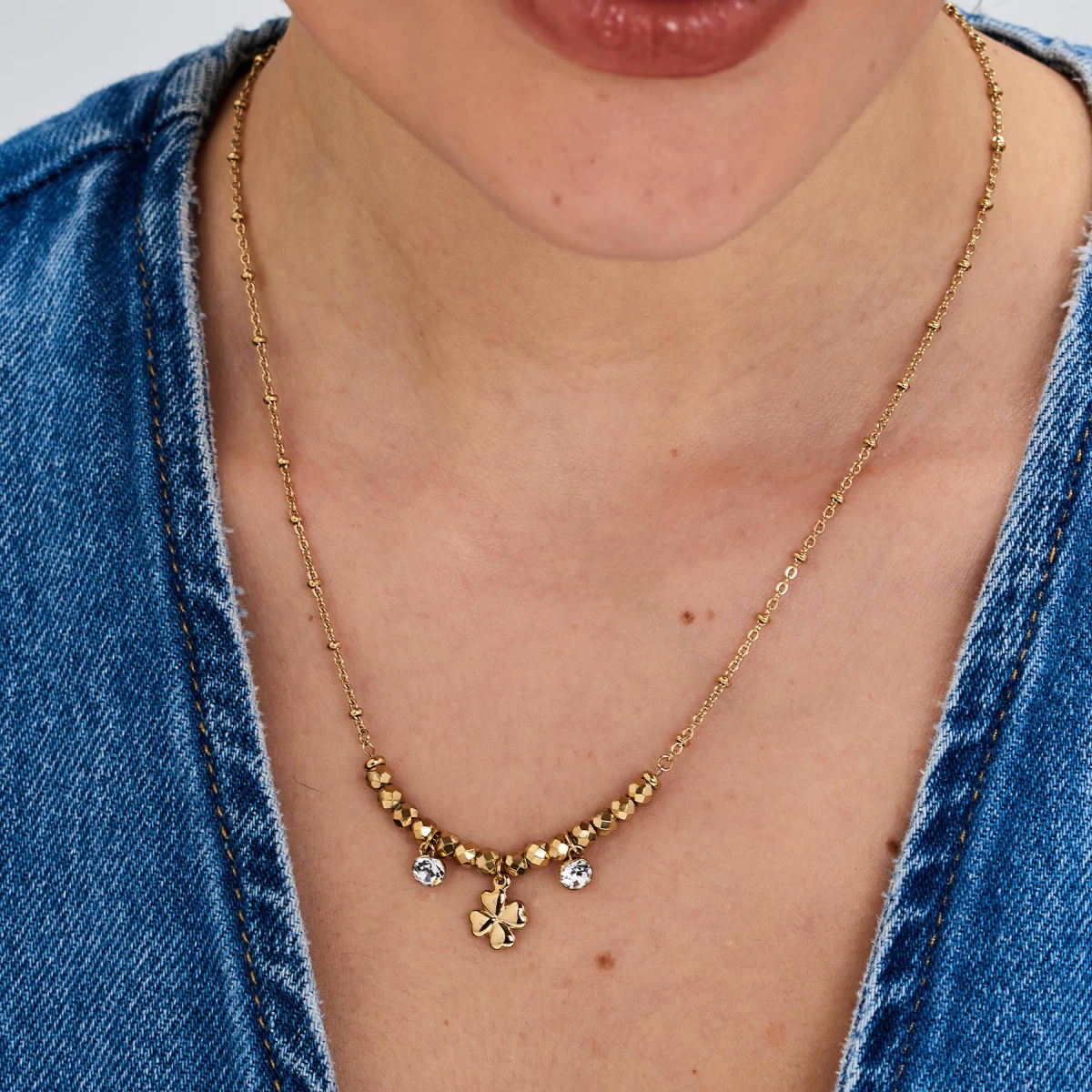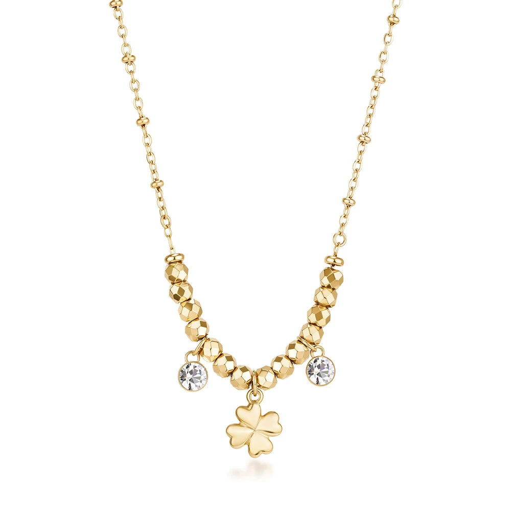 Dámský náhrdelník z chirurgické oceli z kolekce Chakra. Náhrdelník má svoji nositelku ochránit před nepřízní osudu a nevraživostí druhých lidí. Povrch náhrdelníku je pozlacený technologií PVD. Náhrdelník je zdobený bílými krystaly. Délka náhrdelníku 48cm.