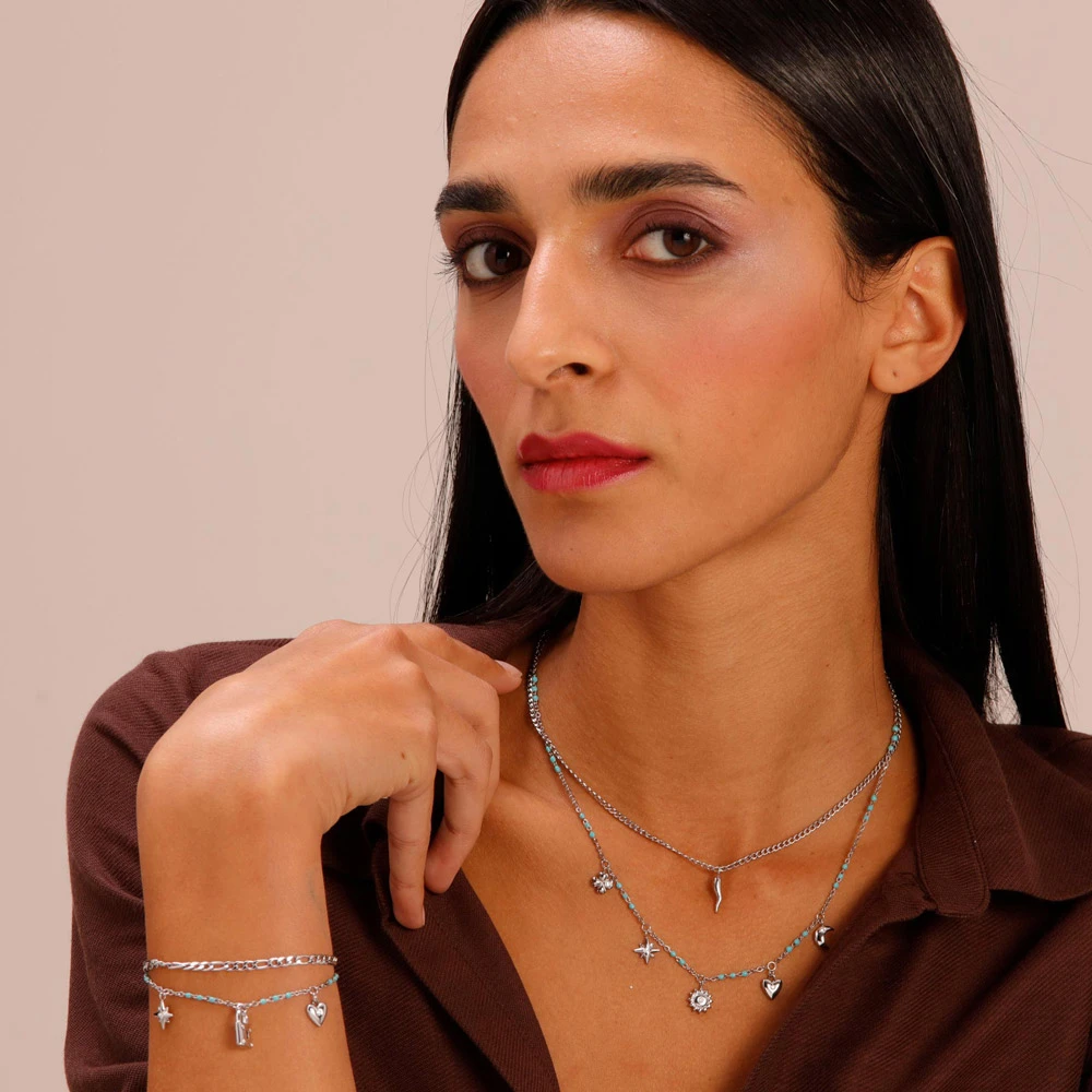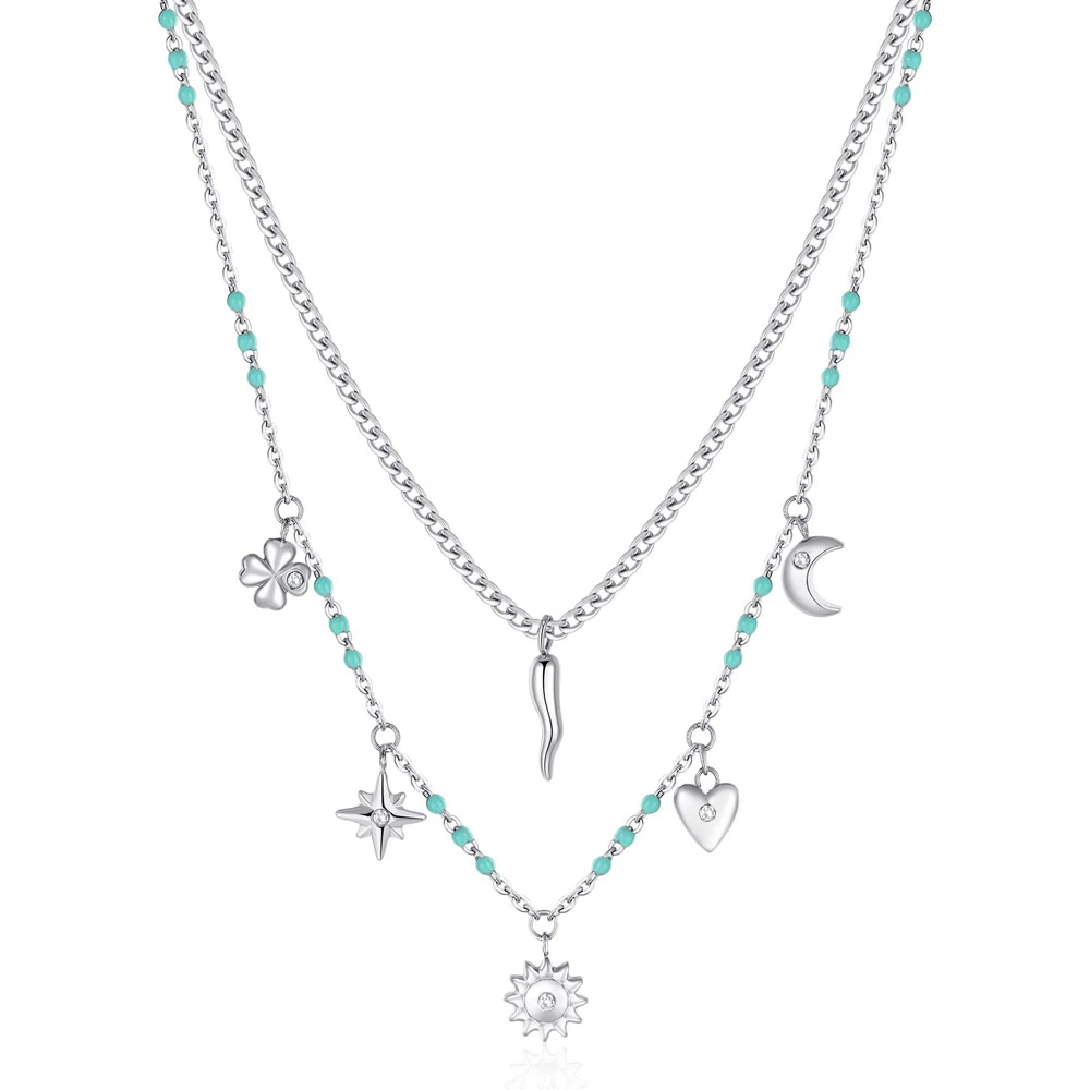 Dámský dvouřadý náhrdelník z chirurgické oceli 316L z kolekce Chant. Povrch náhrdelníku je leštěný, upravený technologií PVD. Náhrdelník je ozdobený přívěšky různých tvarů a krystaly. Zapínání náhrdelníku je karabinové, délka 64 cm.