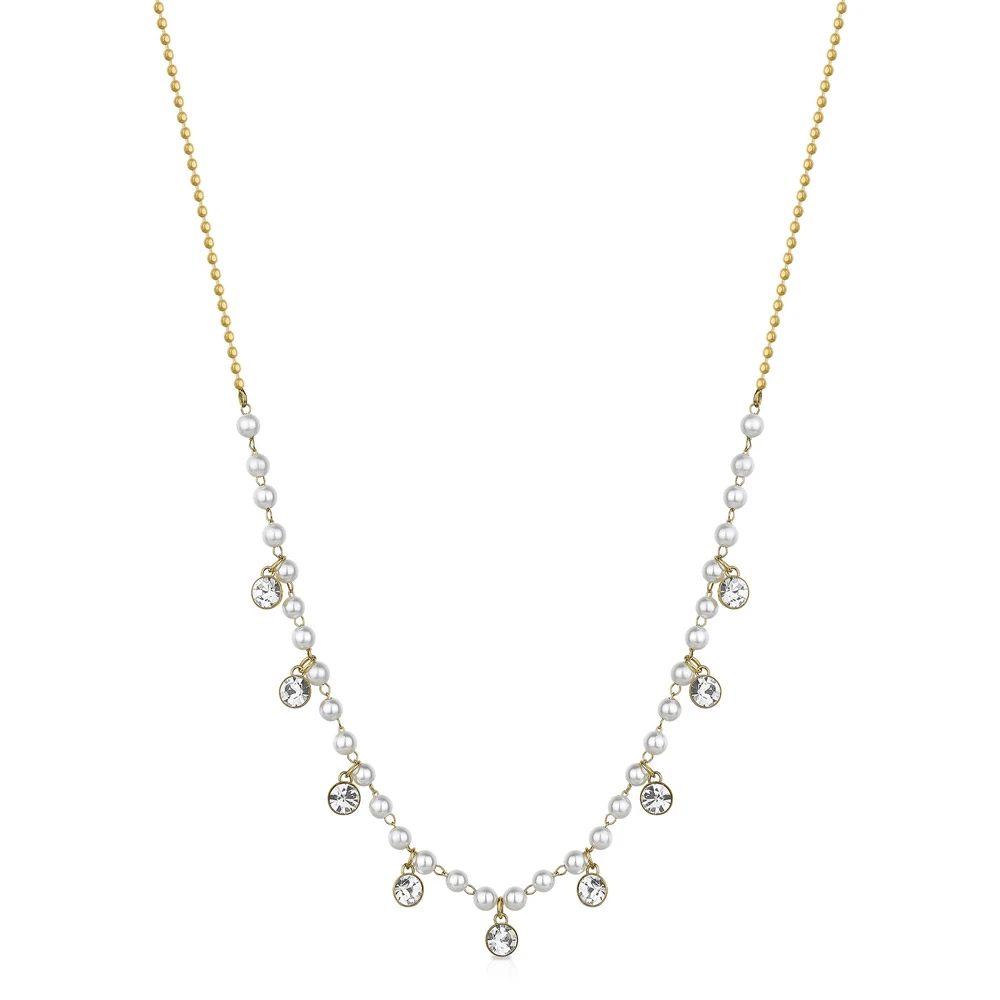 Dámský náhrdelník z chirurgické oceli. Náhrdelník je ozdobený krystaly a umělými perličkami. Povrch náhrdelníku je pozlacený technologií PVD. Náhrdelník má karabinové zapínání, délka náhrdelníku 44,5cm.