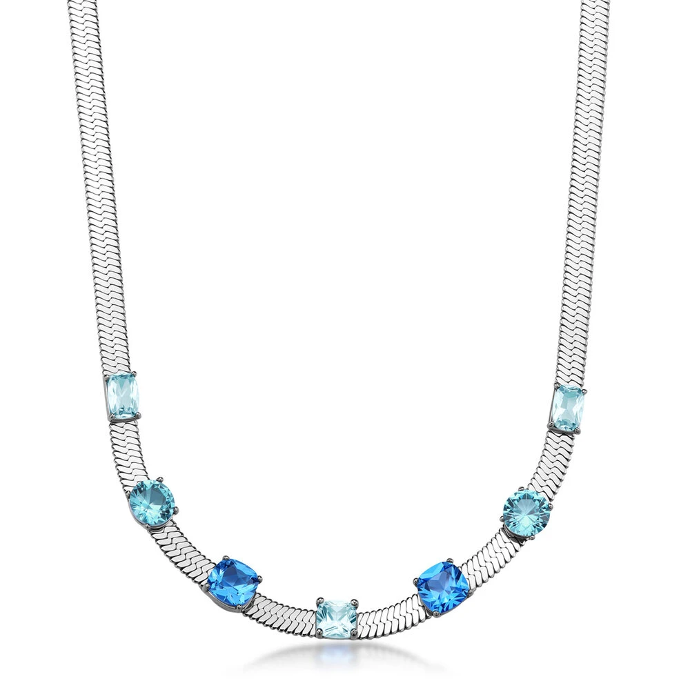 Náhrdelník z chirurgické oceli zdobený zirkony. Povrch náhrdelníku je leštěný, zirkony mají modrou a světle modrou barvu. Náhrdelník je dlouhý 45cm.
