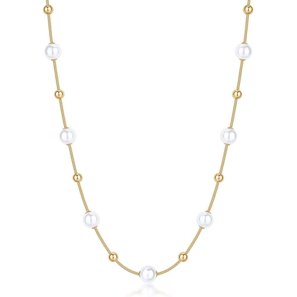 Náhrdelník z chirurgické oceli a umělých perel pro ženy a dívky. Povrch náhrdelníku je pozlacený 14. ti karátovým zlatem. Náhrdelník je dlouhý 45cm.