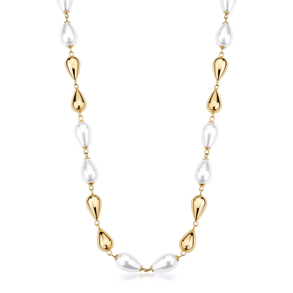 Náhrdelník z chirurgické oceli a umělých perel pro ženy a dívky. Umělé perly a ocelové články mají tvar slziček. Povrch článků z chirurgické oceli je leštěný a pozlacený 14. ti karátovým zlatem. Náhrdelník je dlouhý 45 cm.