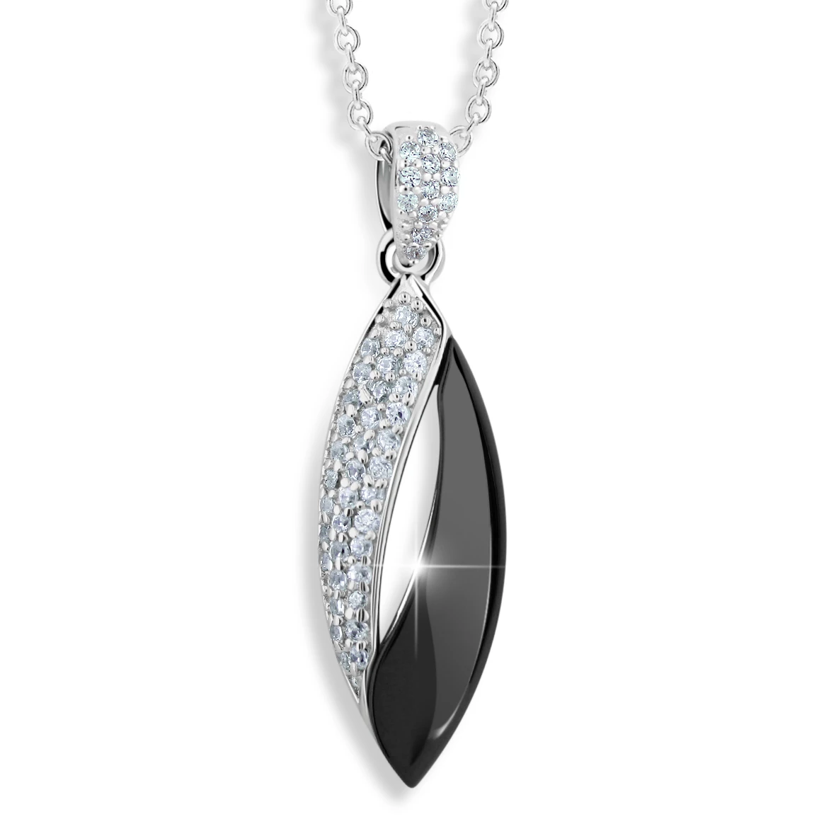 Náhrdelník ze stříbra 925/1000 a hi-tech keramiky. Černá keramická část má hladký lesklý povrch, stříbrná část přívěsku a závěsné očko jsou ozdobené zirkony a mají povrch opatřený vrstvou rhodia. Úprava rhodiováním zaručuje dokonalý a dlouhotrvající vzhled šperku. Rozměr přívěsku: 8x33mm. Náhrdelník je dlouhý 44cm.