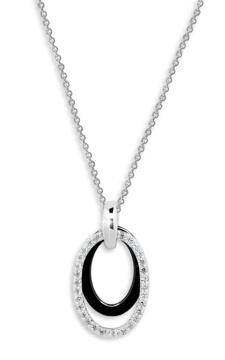 Náhrdelník ze stříbra 925/1000 a hi-tech keramiky. Černý keramický oválek má hladký lesklý povrch, stříbrné závěsné očko a oválek osazený zirkony má porhodiovaný povrch. Úprava rhodiováním zaručuje dokonalý a dlouhotrvající vzhled šperku. Rozměr přívěsku: 13x22mm. Náhrdelník je dlouhý 44cm.