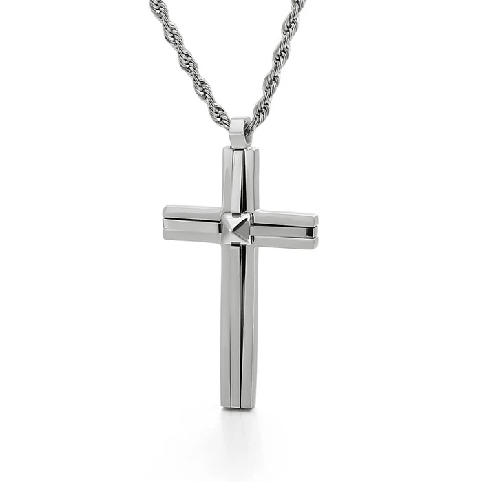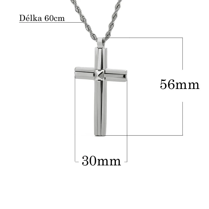 Přívěsek kříž a řetízek z chirurgické oceli. Ocelový řetízek se zapínáním na karabinu je dlouhý 60cm, průměr 2,8mm. Rozměr křížku 56x30mm.