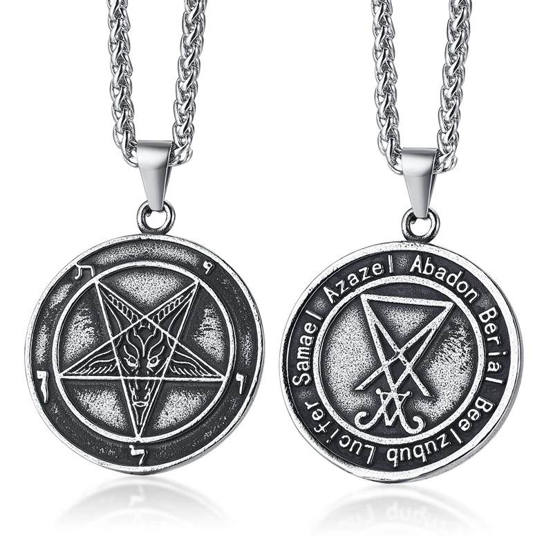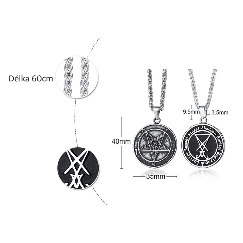 Náhrdelník s přívěskem pentagramu (pěticípé hvězdy). Pentagram představuje velmi silný symbol, který používali a používají čarodějové, gnostici, svobodní zednáři, satanisté, mágové a další po celém světě. Vždy záleží za jakým účelem sílu pentagramu užíváme, zda pro dobro, nebo zlo. Záleží na tom co člověk nosí v srdci. Zlý člověk použije symbol pentagramu pro zlé věci, dobrý člověk naopak využije sílu pentagramu pro dobré věci. Náhrdelník je zhotovený z chirurgické oceli.