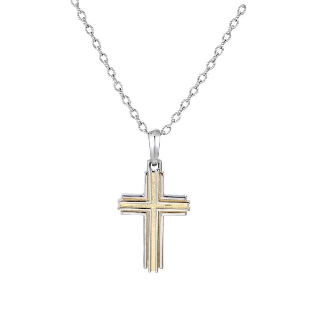 Přívěsek z chirurgické oceli křížek a řetízek představující nadčasové spojení v náhrdelník. Povrch křížku je leštěný částečně pozlacený technologií PVD. Rozměr křížku 33x21mm. Ocelový řetízek má očka široká 2,6mm, délka řetízku 55cm. Zapínání řetízku je karabinové.
