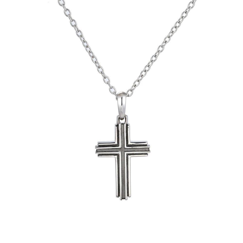 Přívěsek z chirurgické oceli křížek a řetízek představující nadčasové spojení v náhrdelník. Povrch křížku je leštěný částečně v kombinaci s černou barvou PVD. Rozměr křížku 33x21mm. Ocelový řetízek má očka široká 2,6mm, délka řetízku 55cm. Zapínání řetízku je karabinové.