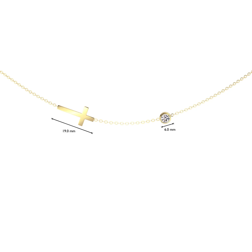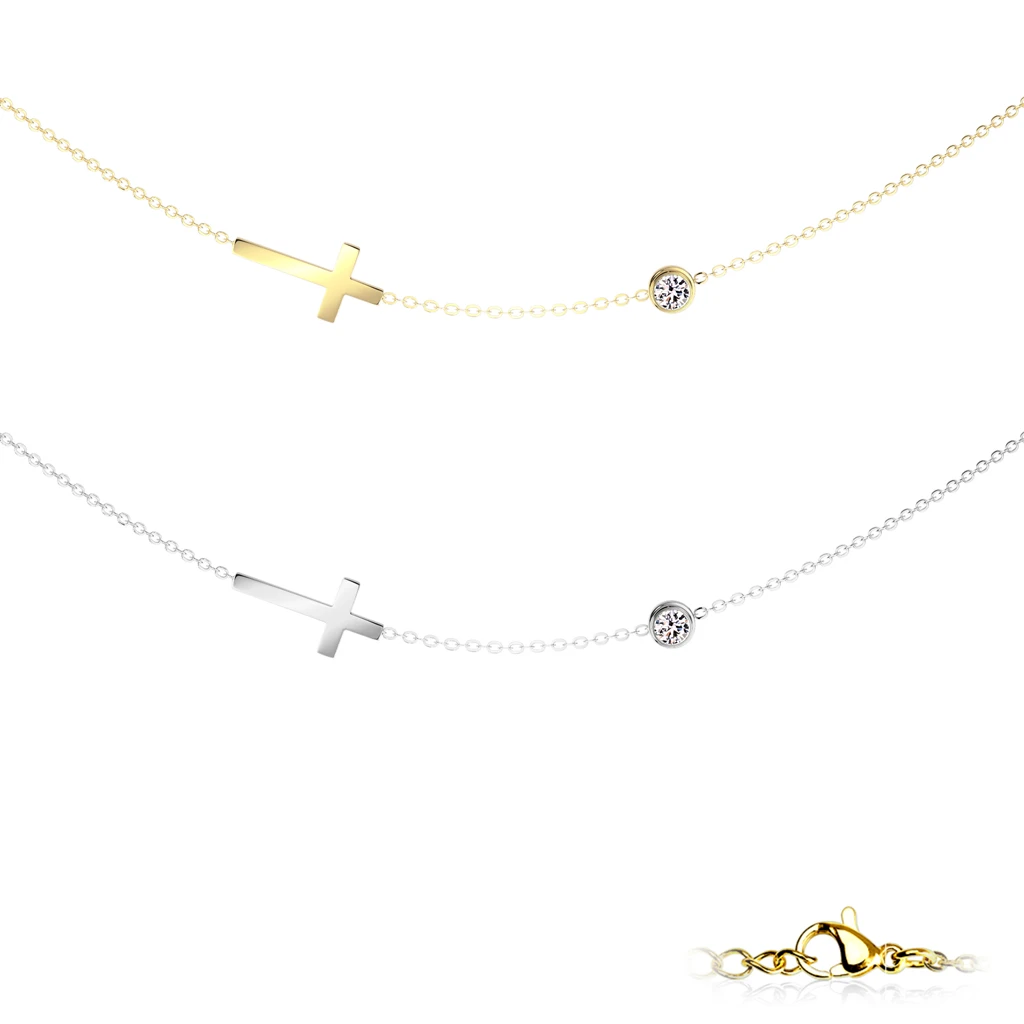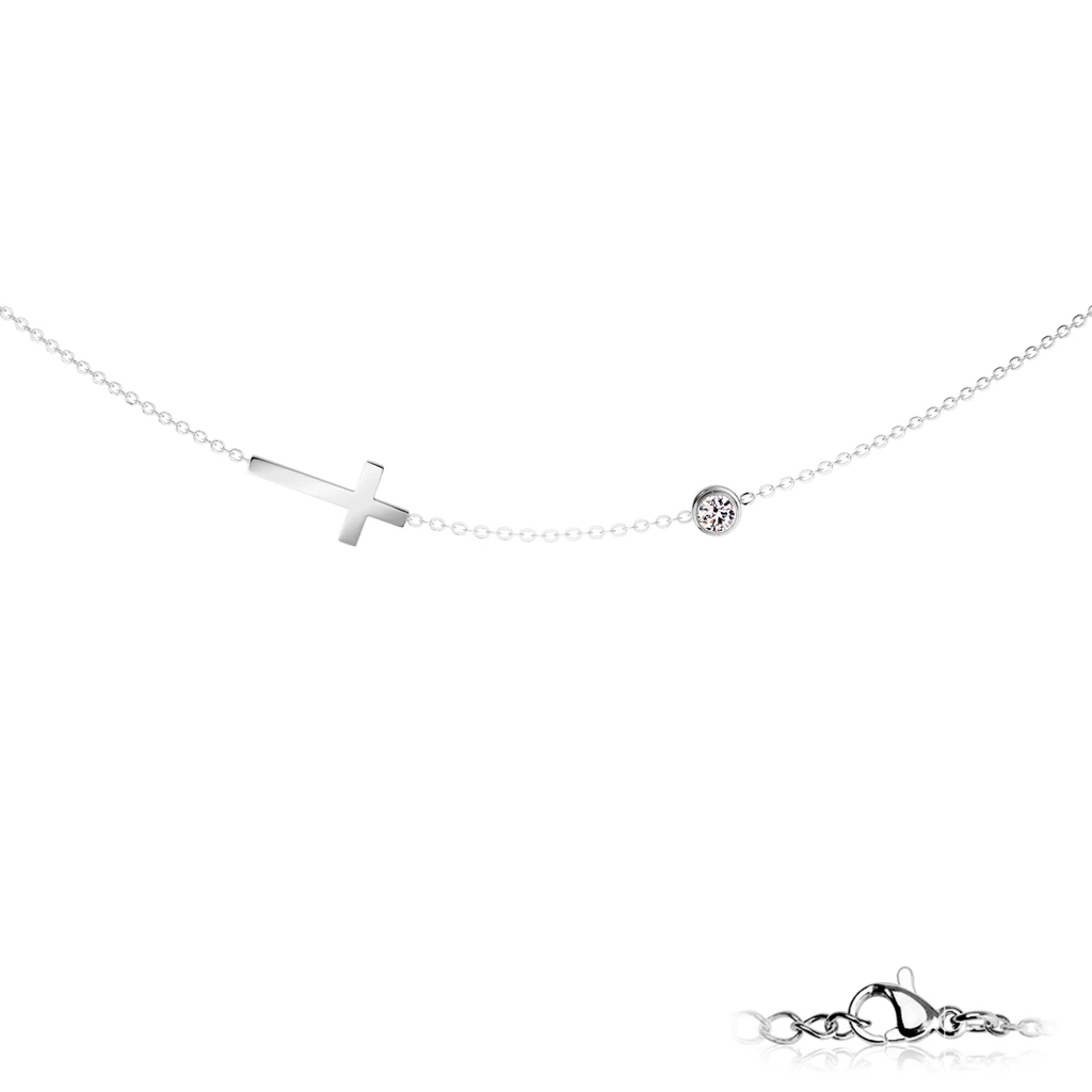 Náhrdelník z chirurgické oceli ozdobený křížkem a zirkonem. Povrch náhrdelníku je leštěný. Křížek je dlouhý 19mm, průměr ozdoby se zirkonem 6,0mm. Délku náhrdelníku lze nastavit v rozmezí 42-45cm.