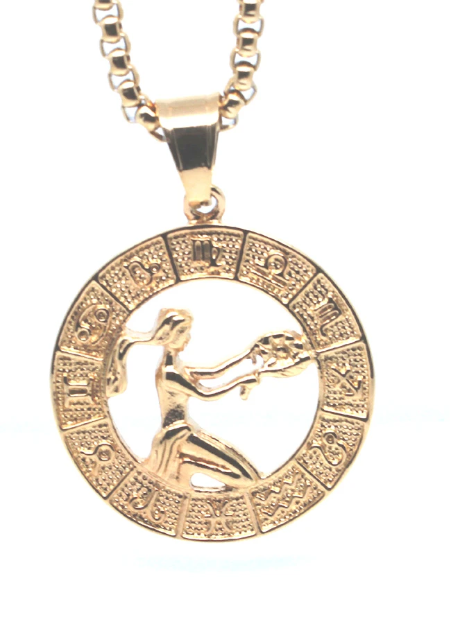 Přívěsek se znamením panny (23.8 - 22.9). Přívěsek je vyrobený z pozlacené chirurgické oceli. Znamení panny je "lemováno" symboly ostatních znamení zvěrokruhu. Součástí náhrdelníku je pozlacený řetízek z chirurgické oceli vzor veneziana se zapínáním na karabinu, dlouhý 60cm. Přívěsek má průměr 30mm. Na přání je možné řetízek zdarma zkrátit.