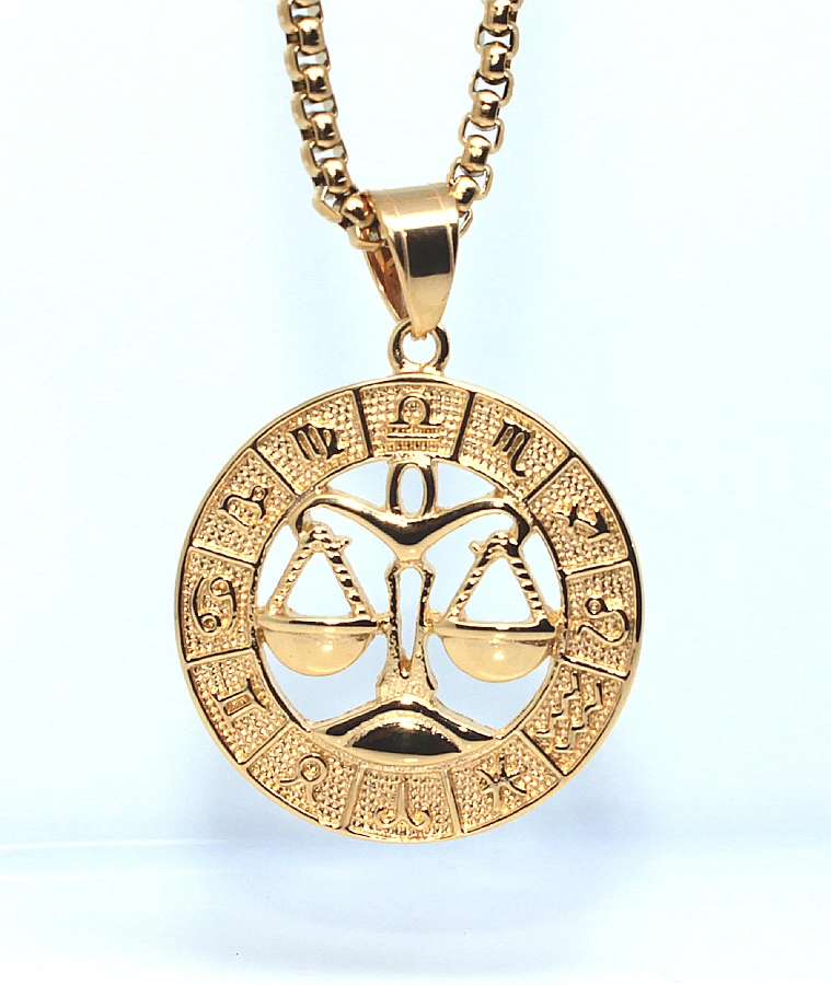 Náhrdelník z chirurgické oceli se znamením vah. Povrch náhrdelník u je pozlacený technologií PVD. Jako všechny ocelové šperky má také tento náhrdelník všechny vlastnosti, pro které jsou šperky z chirurgické oceli stále oblíbené. K těmto vlastnostem patří především odolnost, nevyvolávání alergických reakcí, barevná stálost a příznivá cena při srovnání se šperky z drahých kovů.