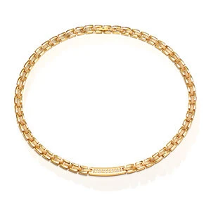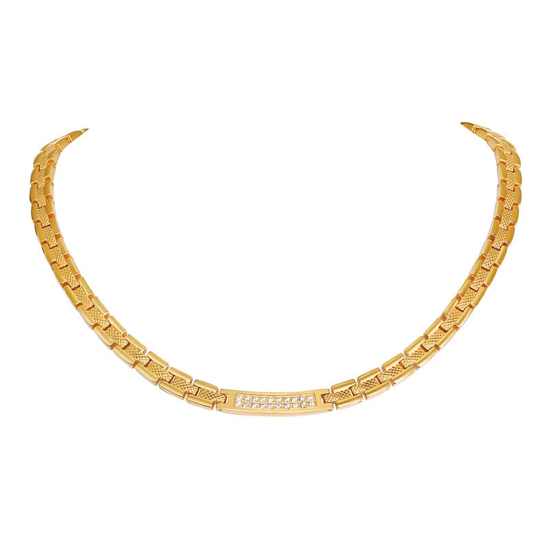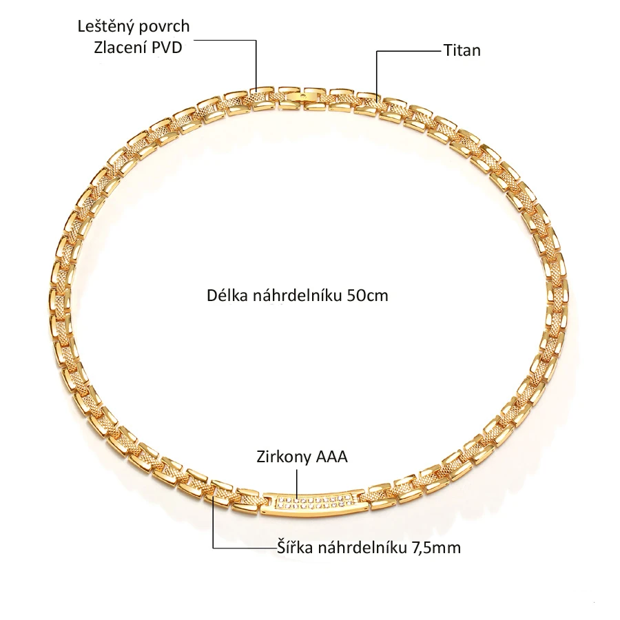 Magnetický náhrdelník z titanu. Náhrdelník má leštěný povrch se vzorem. Povrch náhrdelníku je pozlacený technologií PVD. Délka náhrdelníku 50cm, šířka 7,5mm. Délku náhrdelníku je možné na přání zdarma zkrátit.