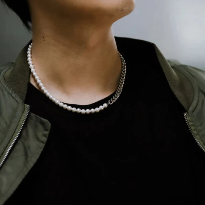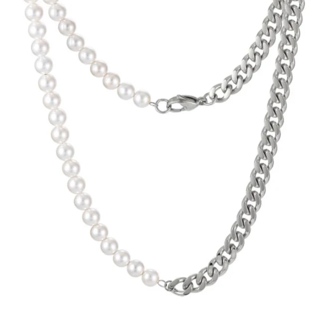 Perlový náhrdelník z chirurgické oceli a přírodních perel. Povrch ocelových částí náhrdelníku je leštěný, bílé perličky dodávají náhrdelníku nádech luxusu. Délka náhrdelníku 50cm. Perličky mají průměr 6mm, řetízková část náhrdelníku je široká 7mm.Zapínání náhrdelníku je karabinové.
