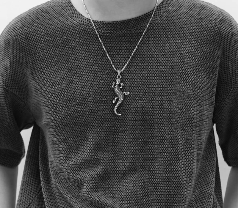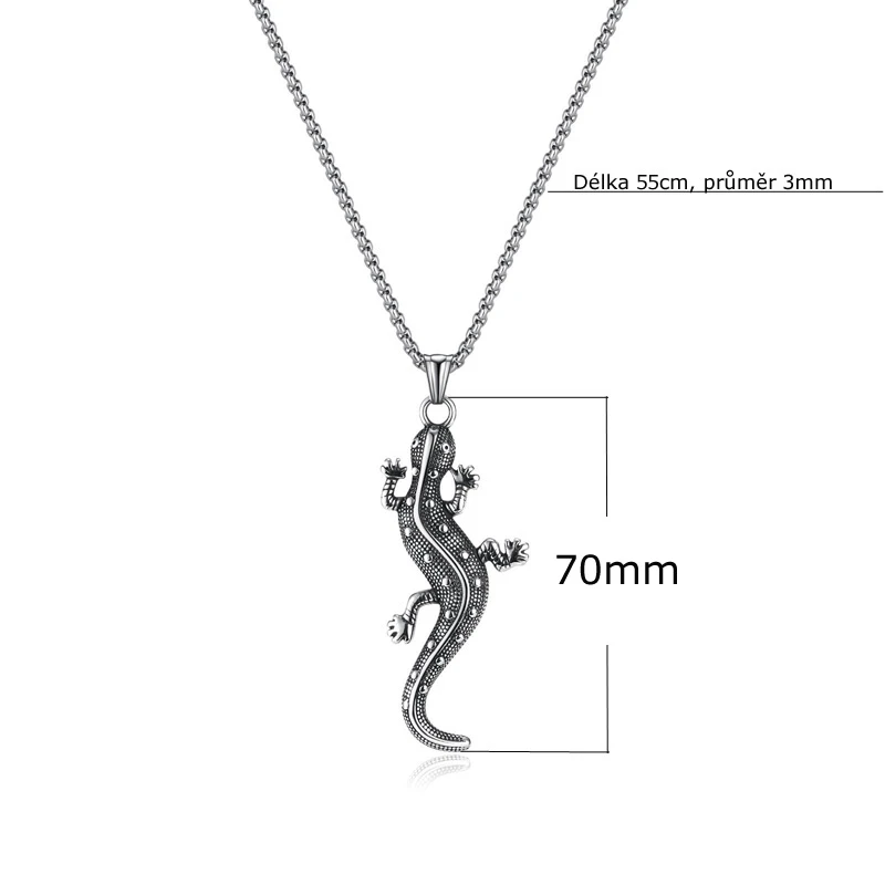 Náhrdelník z chirurgické oceli s přívěskem ještěrky. Přívěsek ještěrky je dlouhý 70mm. K přívěšku patří ocelový řetízek o průměru 3mm, dlouhý 55cm.