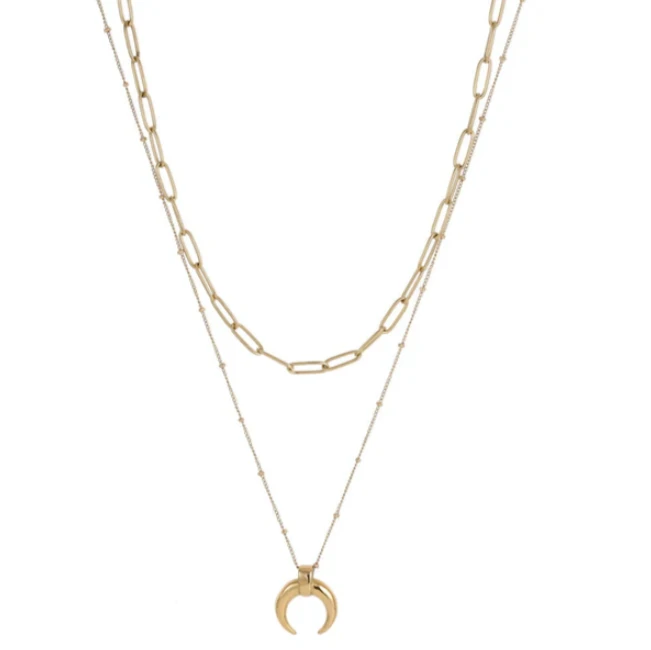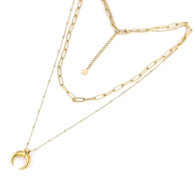 Náhrdelník pro ženy a dívky z chirurgické oceli. Povrch náhrdelníku je pozlacený technologií PVD. Náhrdelník s ozdobou srpku měsíce. Srpek měsíce má průměr 17mm. Slabí řetízek s přívěskem měsíce je dlouhý 53cm, kratší silnější řetízek je dlouhý 43cm. Délku náhrdelníku lze měnit +- 5cm. Zapínání náhrdelníku je karabinové.