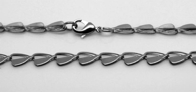 Dámský náhrdelník vyrobený z chirurgické oceli. Povrch náhrdelníku je leštěný. Zapínání je na karabinu. Články tvaru lístečků mají rozměr 9x6mm.