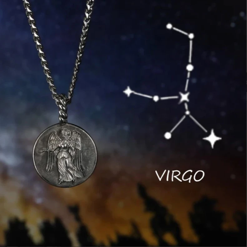 Náhrdelník z chirurgické oceli se znamením Panny (23.8 - 22.9). Náhrdelník tvoří kulatý přívěsek s plastickým znamením Panny a řetízek vzor ankr. Přívěsek má průměr 20mm, řetízek je široký 2,2mm, dlouhý 50cm.