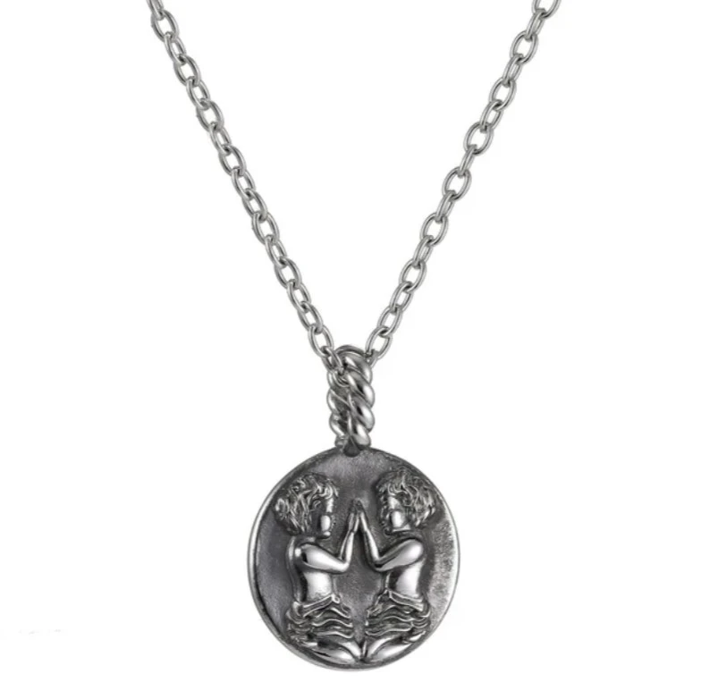 Náhrdelník z chirurgické oceli se znamením Blížence (22.5 - 22.6). Náhrdelník tvoří kulatý přívěsek s plastickým znamením Blížence a řetízek vzor ankr. Přívěsek má průměr 20mm, řetízek je široký 2,2mm, dlouhý 50cm.