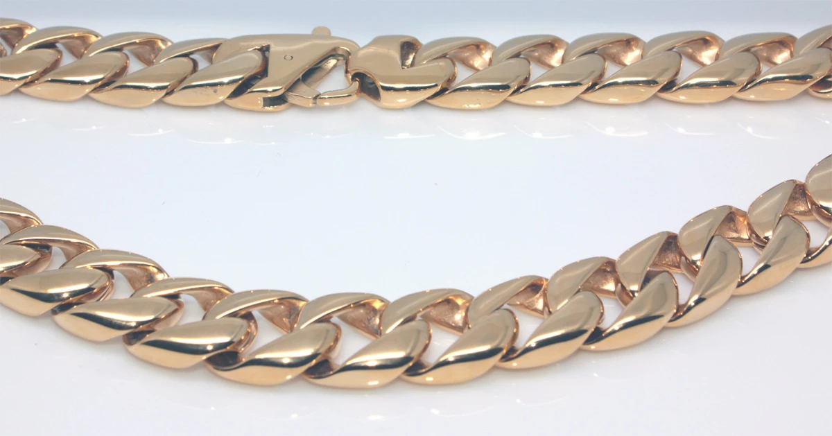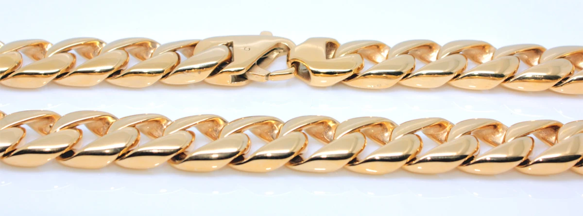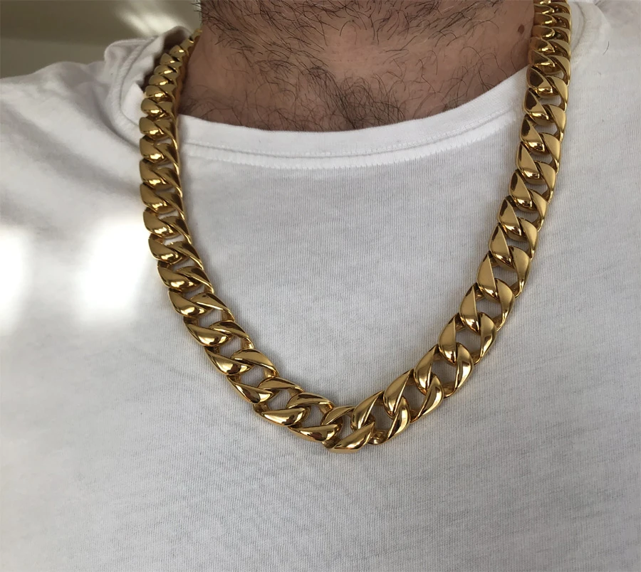 Dlouhý náhrdelník z chirurgické oceli s pozlaceným povrchem. Leštěný pozlacený povrch je upravený technologií IP. Zapínání náhrdelníku je na karabinu. Náhrdelník je široký 15mm, délka 70cm.