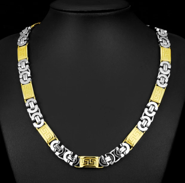 Ocelový náhrdelník se vzorem meandr, který dostal svůj název podle klikatého toku dnešní Turecké řeky Menderez. Povrch náhrdelníku je leštěný, články se vzorem jsou pozlacené technologií PVD. Náhrdelník má karabinové zapínání. Šířka náhrdelníku 11mm, délka 55cm. Na přání lze délku náhrdelníku zdarma zkrátit.