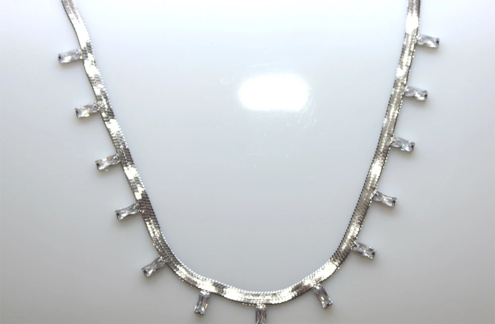 Náhrdelník z chirurgické oceli zdobený zirkony. Povrch náhrdelníku je leštěný. Řetízek hádek je široký 4mm, zirkony ,mají rozměr 2,5x5,5mm. Délku náhrdelníku lze nastavit v rozmezí 40-45cm.