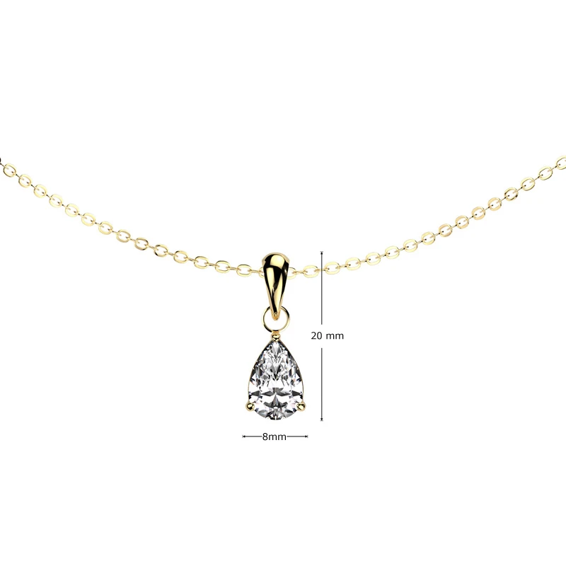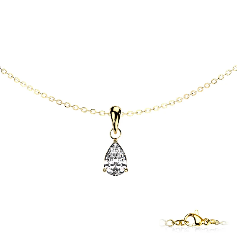 Náhrdelník z chirurgické oceli ozdobený zářivým zirkonem ve tvaru kapky. Náhrdelník má leštěný povrch pozlacený technologií PVD. Rozměr přívěsku 20x8mm najdete vyobrazený na podpůrné fotografii. Řetízek je široký 1mm, délku řetízku lze nastavit v rozmezí 41-46cm.