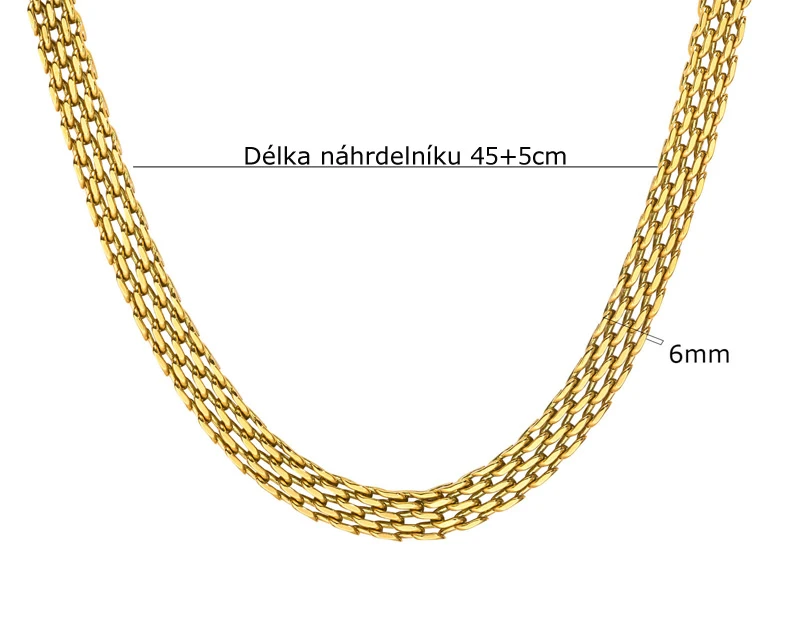 Zlatý náhrdelník z chirurgické oceli. Náhrdelník je pozlacený technologií PVD. Náhrdelník má karabinové zapínání. Šířka náhrdelníku 6mm, délku náhrdelník lze nastavit v rozmezí 45-50cm.