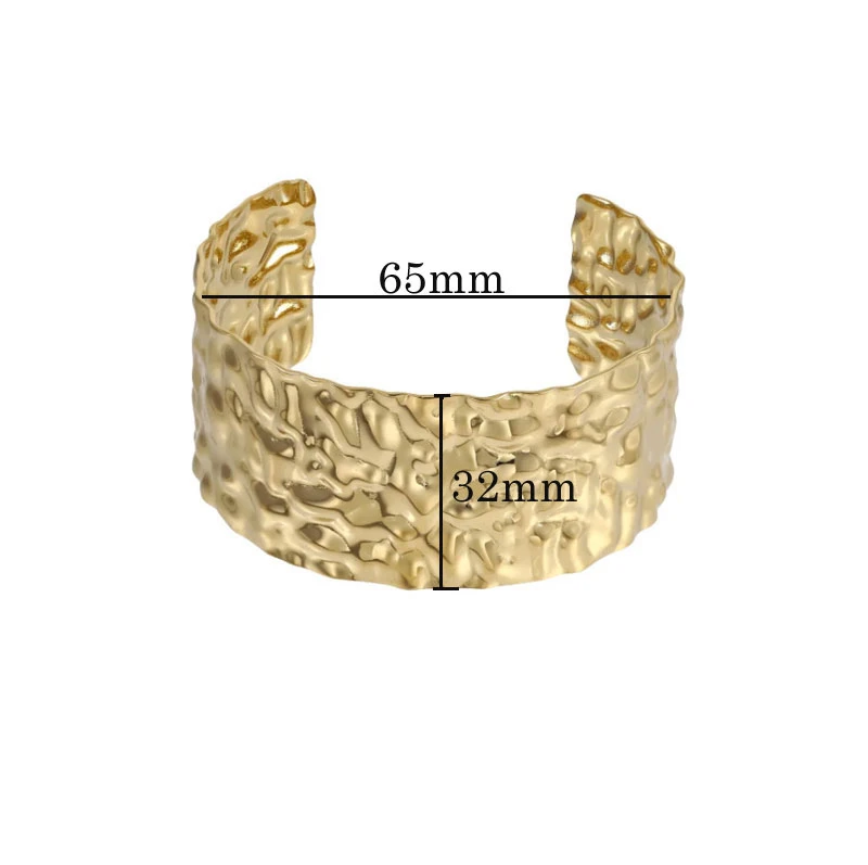 Pevný náramek z chirurgické oceli s povrchem pozlaceným 14k žlutým zlatem. Vnitřní šíře náramku 65mm, šířka náramku 32mm. Rozměry najdete zobrazené na podpůrné fotografii.